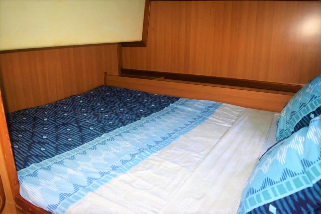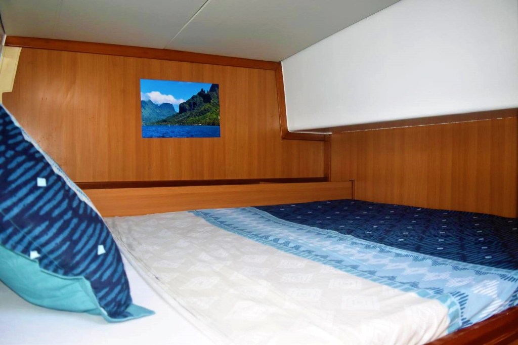 Véritable petit cocon, chaque cabine est munie de hublots avec vue sur le lagon. Elles disposent d’une salle de bain privée et vous assurent une intimité ainsi qu’ un confort total.