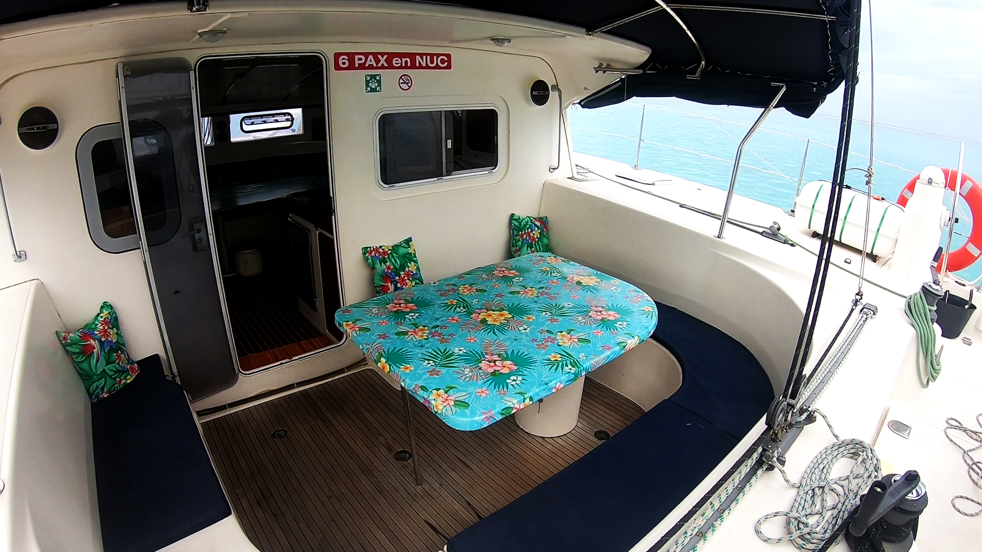 à l’ombre du soleil, la terrasse extérieure appelée cockpit est idéale pour y déjeuner , discuter ou se détendre après les activités nautiques.